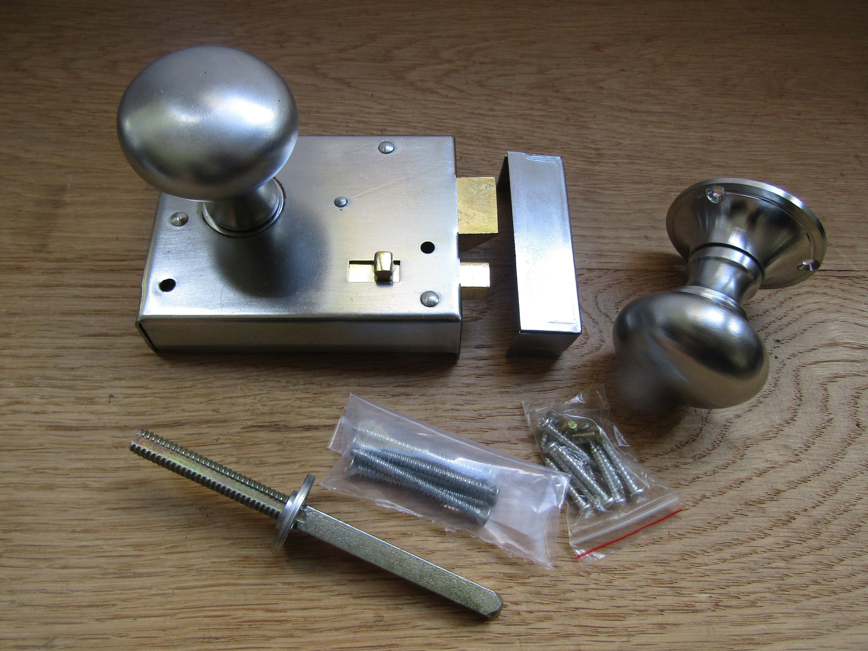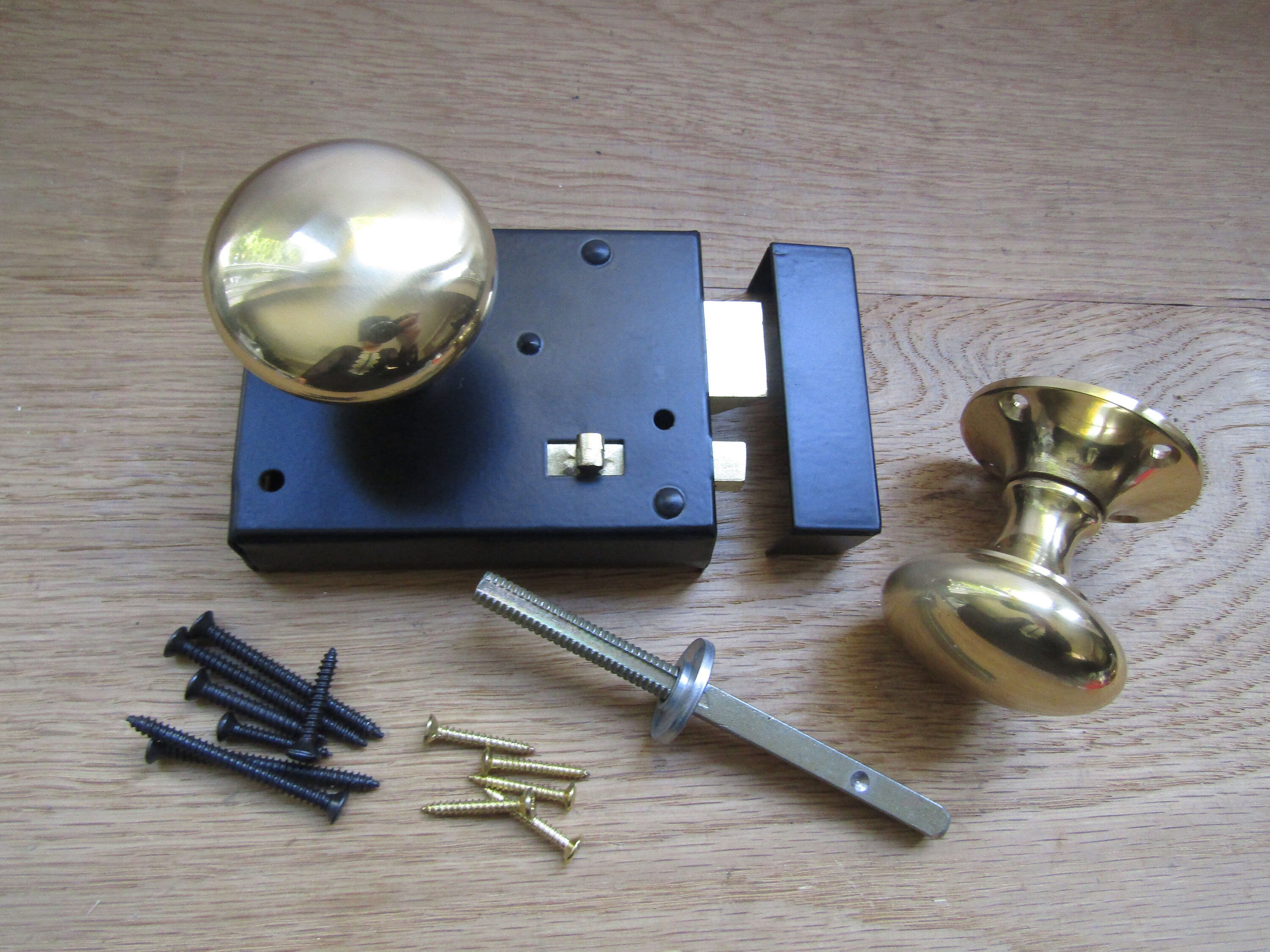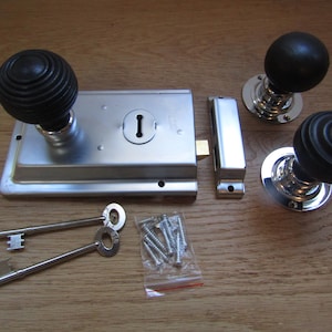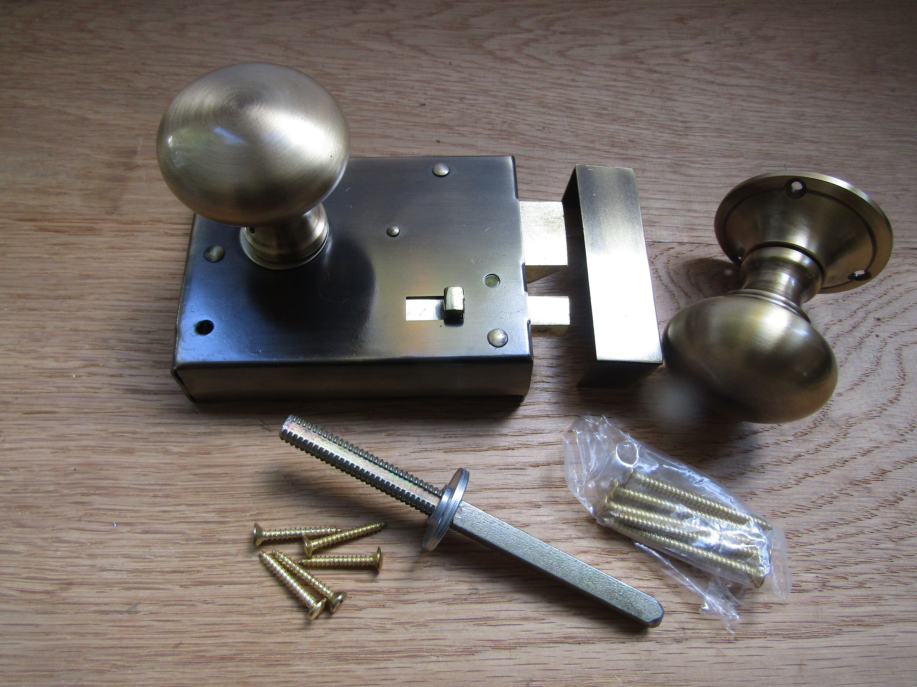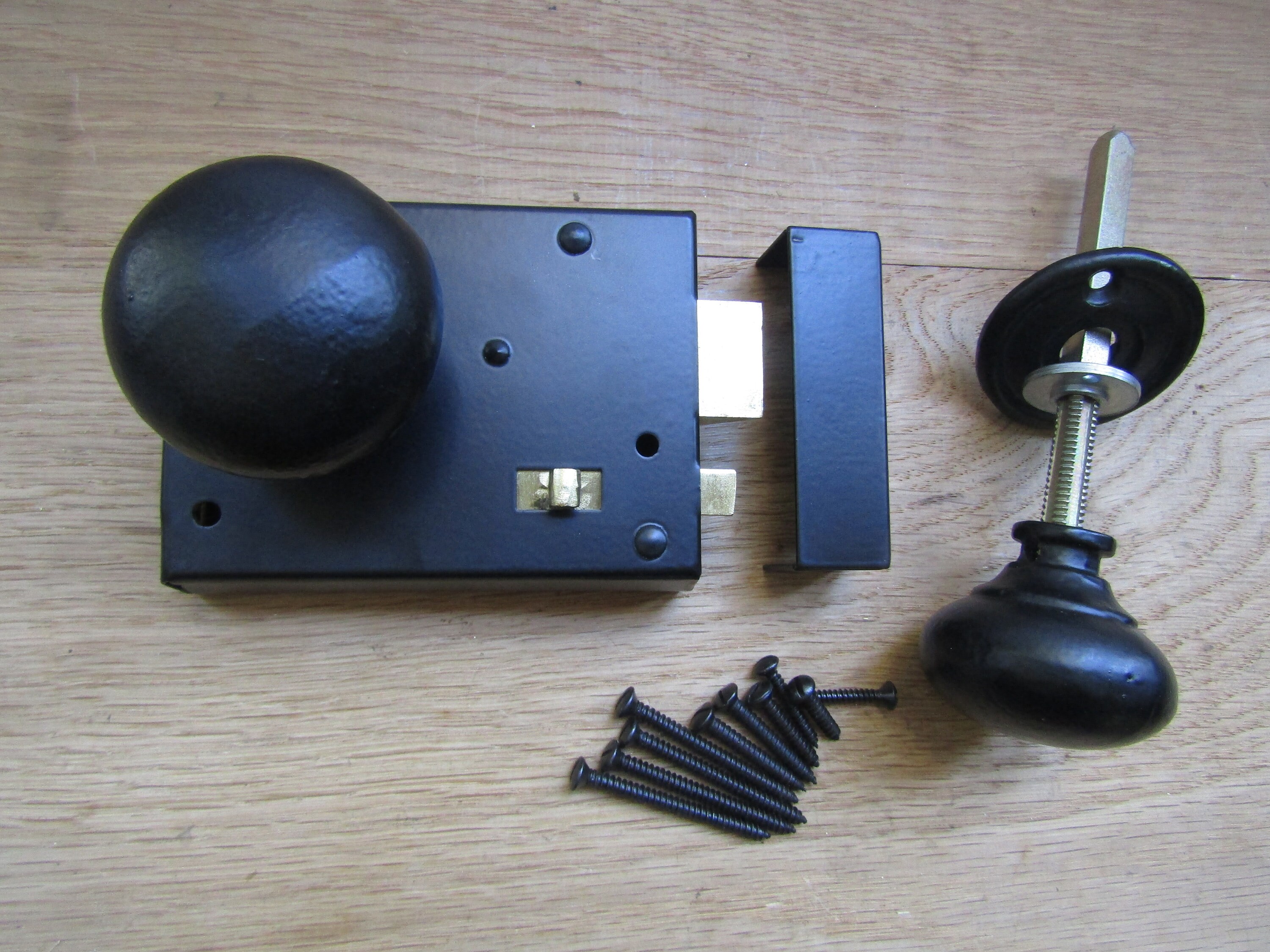 The door latch is cheap stamped steel and is riveted together so you can’t fix it when it broke. It broke the first week of install, trapping a guest in our bathroom. Have installed many rim latches (old and new) but this one is junk. The retractable bolt is weakly screwed to a stamped steel plate and the screws came out. Junk lock.
