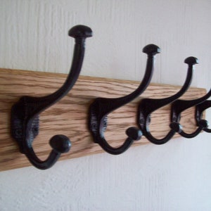 This listing is for a handmade solid oak wooden wall mounted coat rack, with cast iron hooks. Perfect for an entryway or porch.