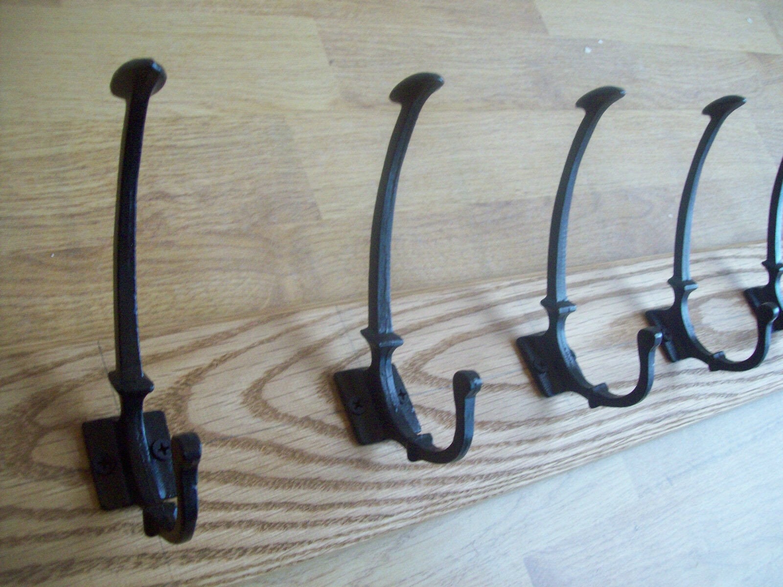 UK Handmade Solid Oak Wood Rustic Wooden Wall Mounted Hat and Coat Hook Rail Rack Hanger Coat Rail cast iron Spoon End Black antique hooks