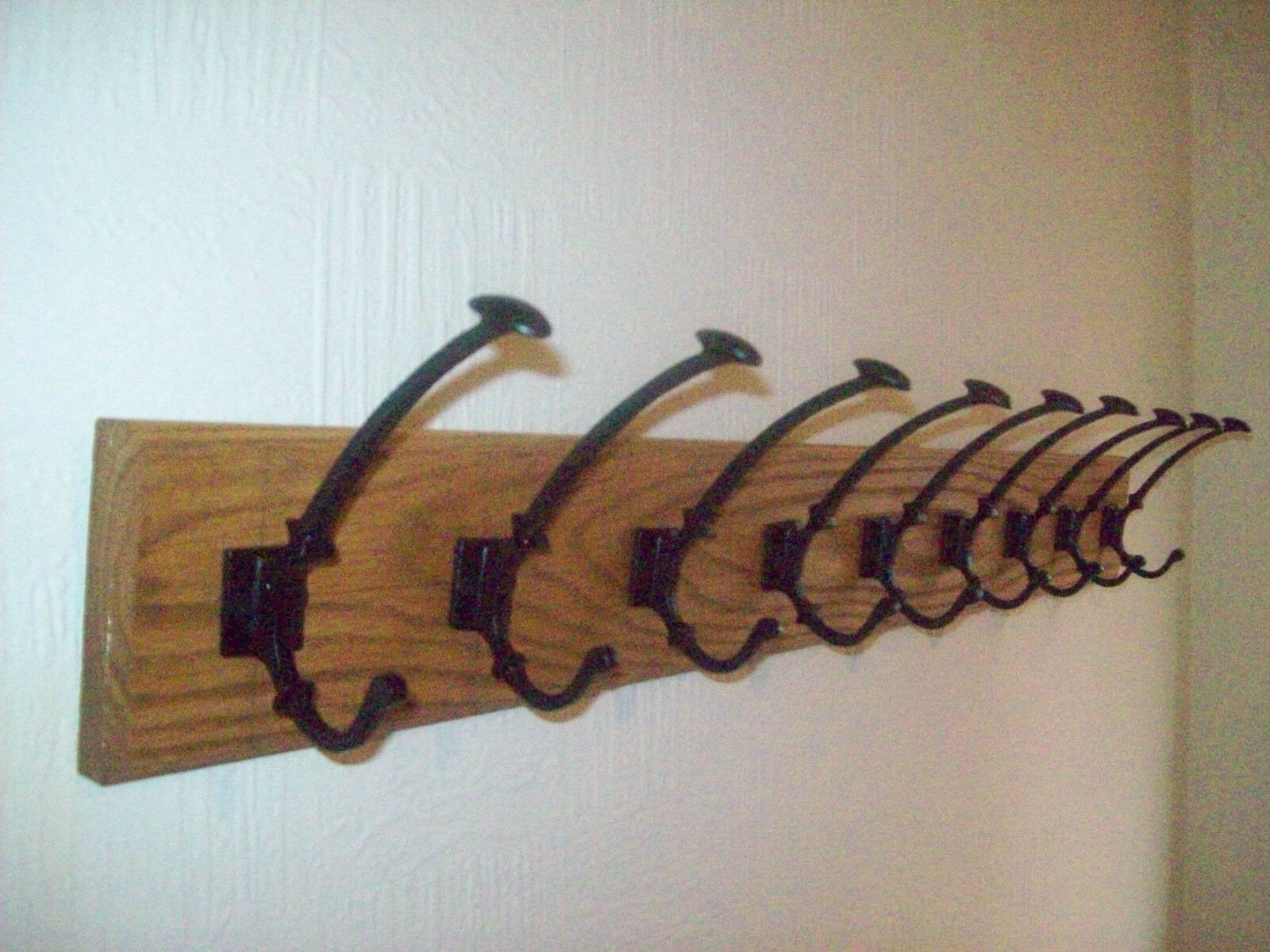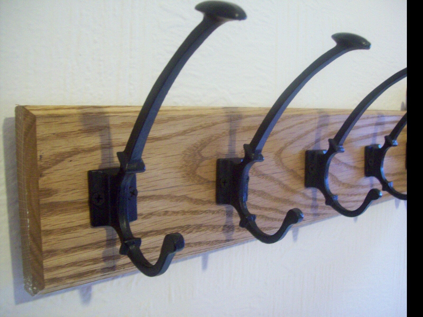 This listing is for a handmade solid oak wooden wall mounted coat rack, with cast iron hooks. Perfect for an entryway or porch.