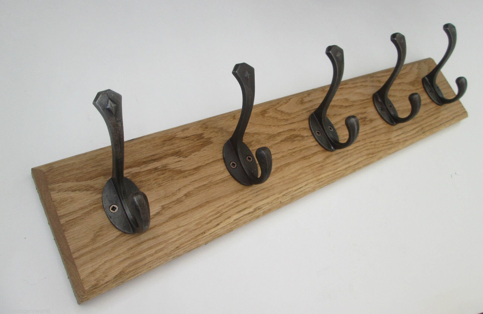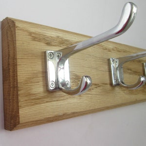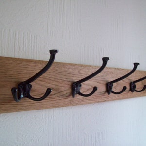 This listing is for a handmade solid oak wooden wall mounted rack, with cast iron hooks.